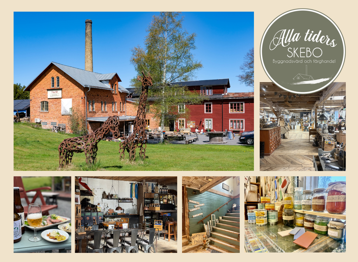 Men butiken är mycket mer - vi har även handplockade inredningsdetaljer, gamla möbler, kläder, beslag och konsthantverk. Dessutom en stor loppis med fynd för dig och ditt hem, samt för dina byggnadsvårds-projekt. I vår mysiga bistro serveras mat och fika och du kan dricka Bengt egna hantverksöl. Då och då bjuder vi in till olika event. Vill du ha hjälp med målning har vi en egen målerifirma, och vår målarmästare Bengt håller kurser i t.ex marmorering och ådring. Våra fina lokaler kan hyras för egna konferenser och fest.