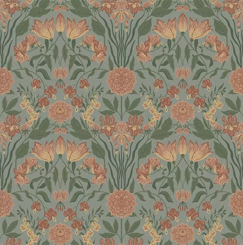 En blomstrande fest på väggen. Trädgården är en tapet fylld av liv och färg, inspirerad av den egna täppan där iris, löjtnantshjärta och dahlia samsas i rabatten. Mönstret är rikt och rytmiskt, som en blomstrande fest där varje detalj bär på glädje och närvaro. De djupa, varma färgerna ger en levande stämning, samtidigt som kompositionens mjukhet skapar balans och harmoni.